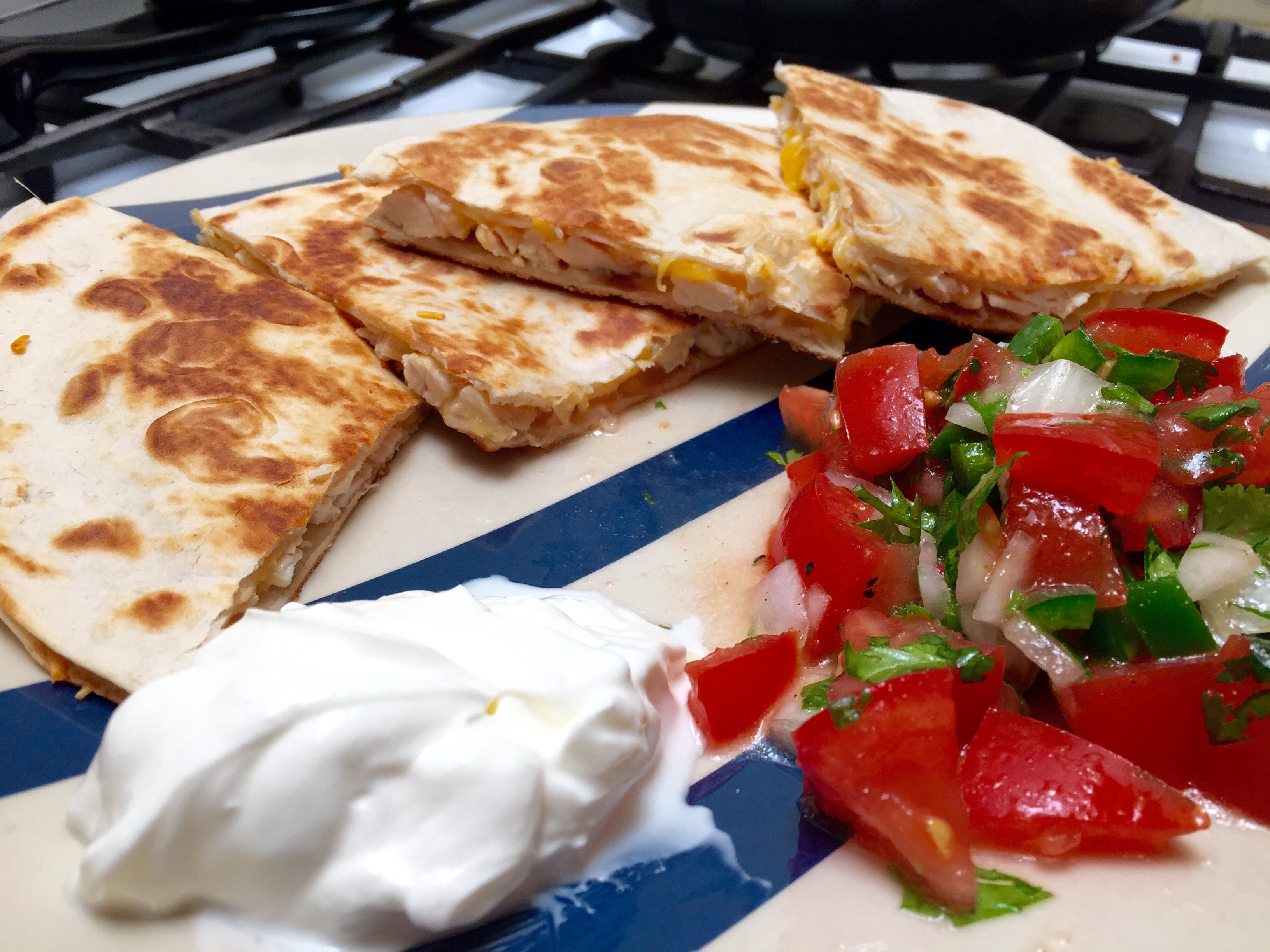 Leftovers are an opportunity for creativity. They’re also a chance to keep it simple. After a fabulous roasted chicken dinner, there are almost always leftovers. You can do so many dishes with leftover chicken. Today, I opted for the chicken quesadilla. One frying pan. Three ingredients: flour tortillas, cheese, and chopped chicken. Super easy. Super tasty. I’m not even going to bother with cooking instructions. It’s pretty self-explantory.
