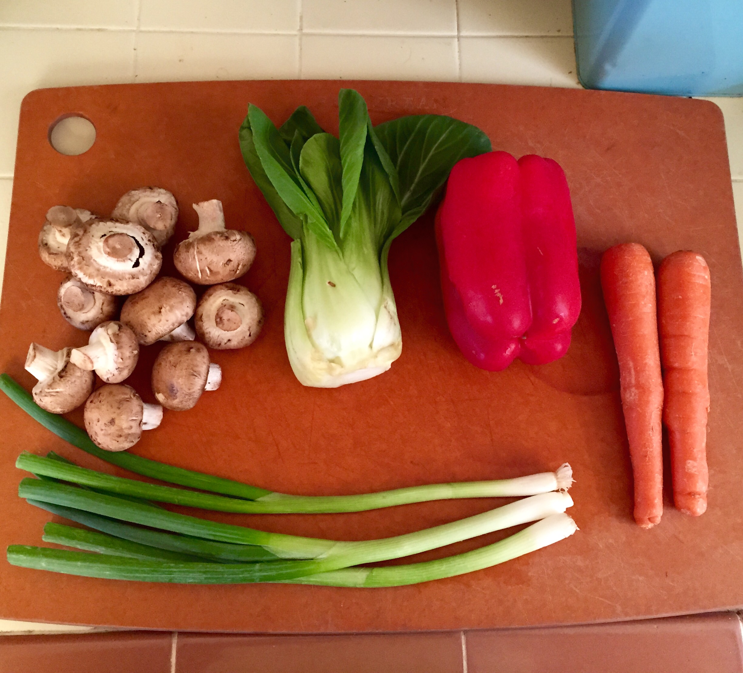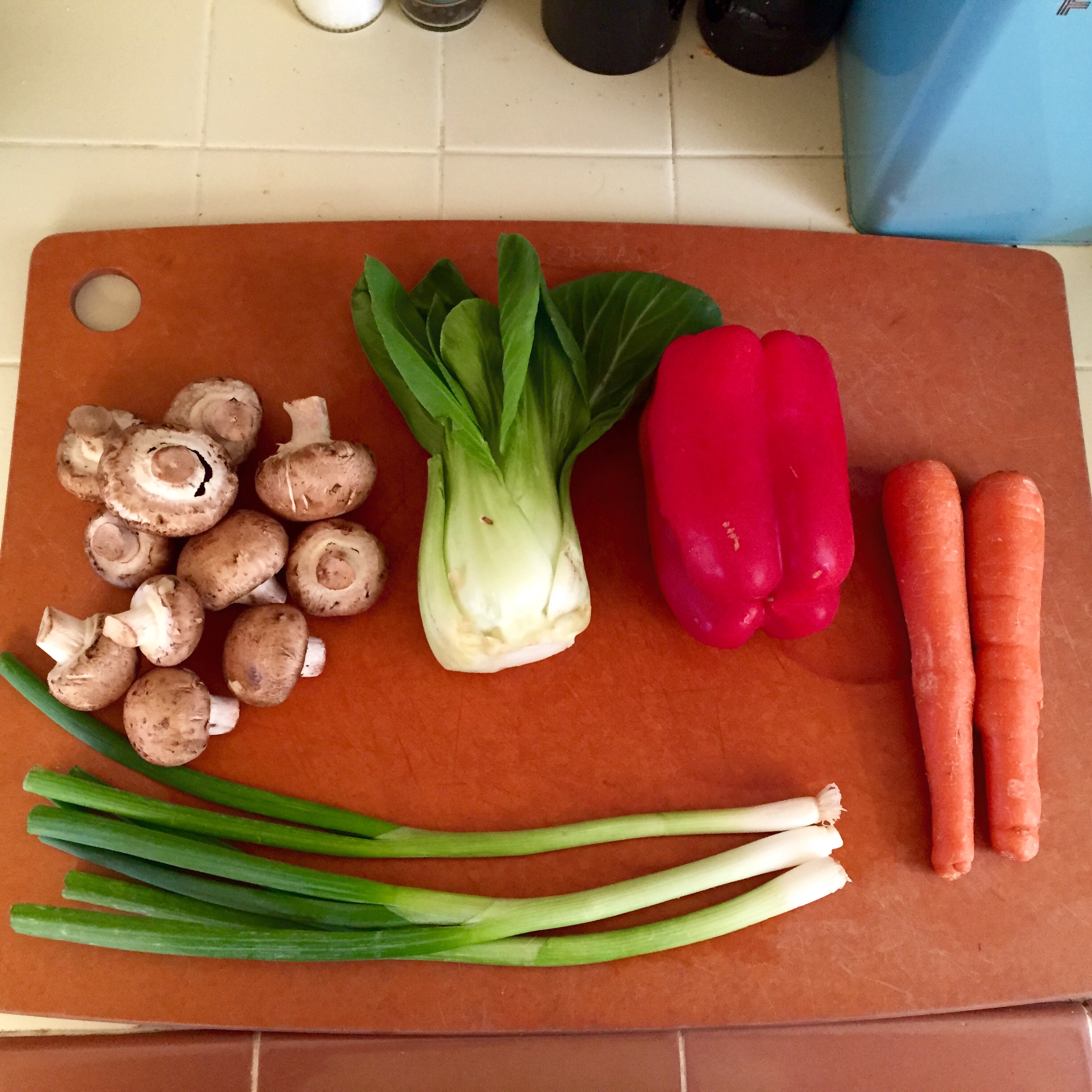 - 1 baby bok choy, chopped (separate stems from leaves, reserve leaves for last addition to stir-fry)
