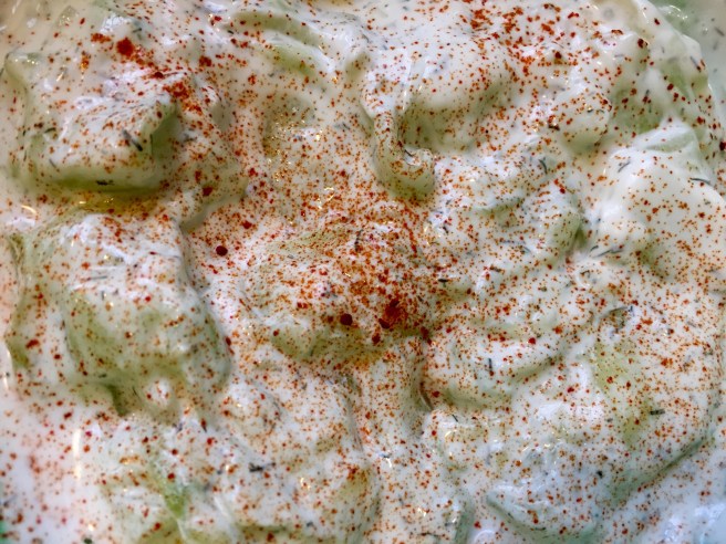 Using your (clean) hands, gently squeeze excess water from cucumbers and drain that water from the bowl. Mix in sour cream, white vinegar, and dill. Sprinkle with paprika. Serve and enjoy.